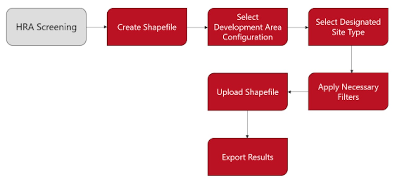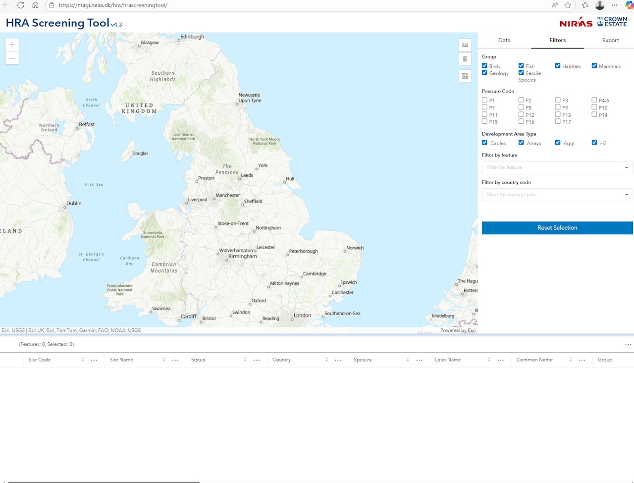 The purpose of the tool is to identify Protected Sites (SACs, SPAs and Ramsar sites) and their features where connectivity exists and to present screening results in a clear and concise format, reducing the need for extensive documentation, static maps and tables. The tool incorporates an innovative web-based GIS platform integrating interactive data sharing and advanced spatial analysis. The tool includes the capability to run screening for Marine Conservation Zones (MCZ).