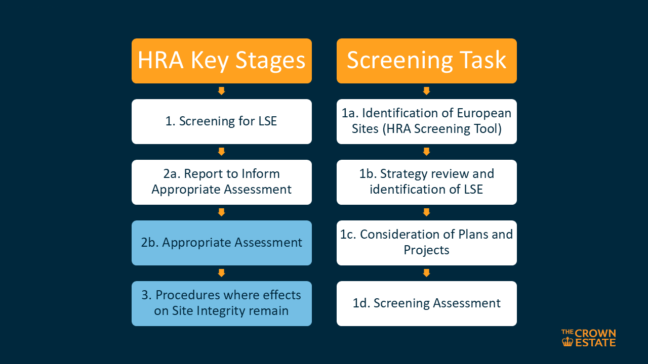 The initial stages of Plan level HRA (Principles, Screening and Report to Inform Appropriate Assessment – see Figure 1 below) are undertaken by The Crown Estate’s technical advisors following competitive tendering. Once established the HRA process commences and part of the screening utilises the Protected Sites (PS) Screening tool, initially developed by NIRAS for The Crown Estate for the Round 4 Plan level HRA.
